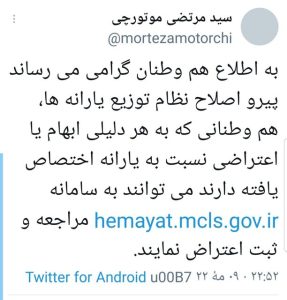 به گزارش پایگاه خبری تحلیلی دیار عیار، سیدمرتضی موتورچی در صفحه شخصی‌اش در توییتر اعلام کرد: به اطلاع هم وطنان گرامی می رساند پیرو اصلاح نظام توزیع یارانه ها، هم وطنانی که به هر دلیلی ابهام یا اعتراضی نسبت به یارانه اختصاص یافته دارند می توانند به سامانه hemayat.mcls.gov.ir مراجعه و ثبت اعتراض کنند.»