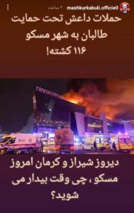 شیخ زکریا مشکور کابلی، عضو ارشد جبهه مقاومت ملی افغانستان در یک استوری با اشاره به این که حملات داعش تحت حمایت طالبان به شهر مسکو ۱۱۶ کشته برجای گذاشته، نوشت: دیروز شیراز و کرمان، امروز مسکو، چه وقت بیدار می شوید؟
